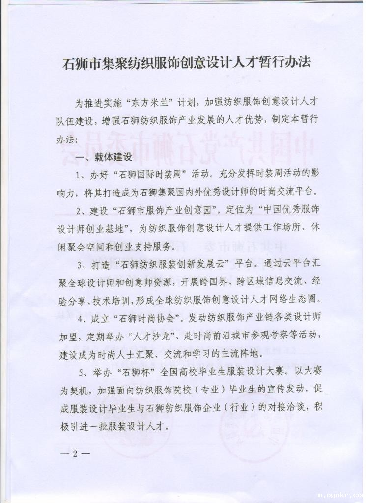 关于印发《石狮市集聚纺织服装创意设计人才暂行办法》的通知